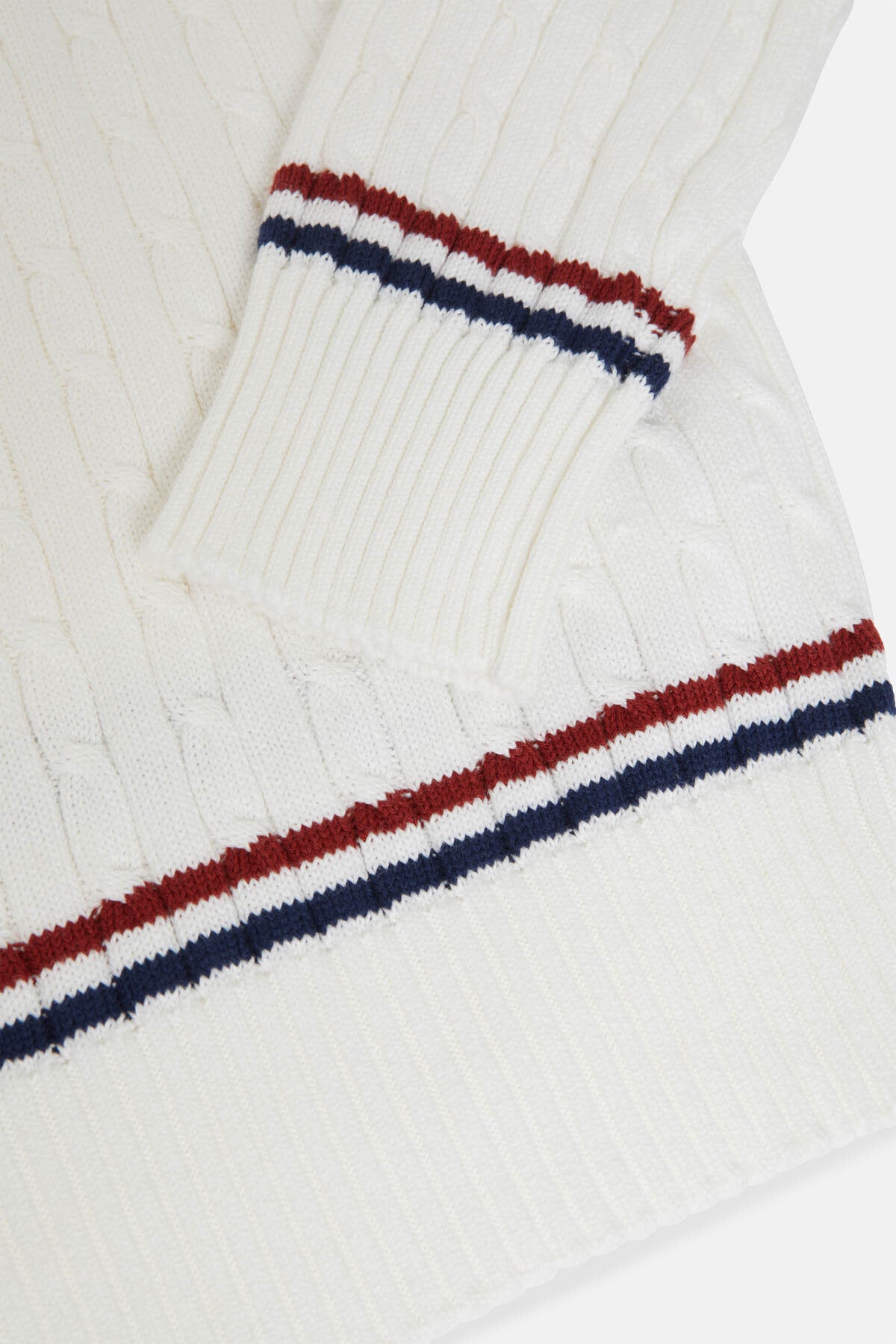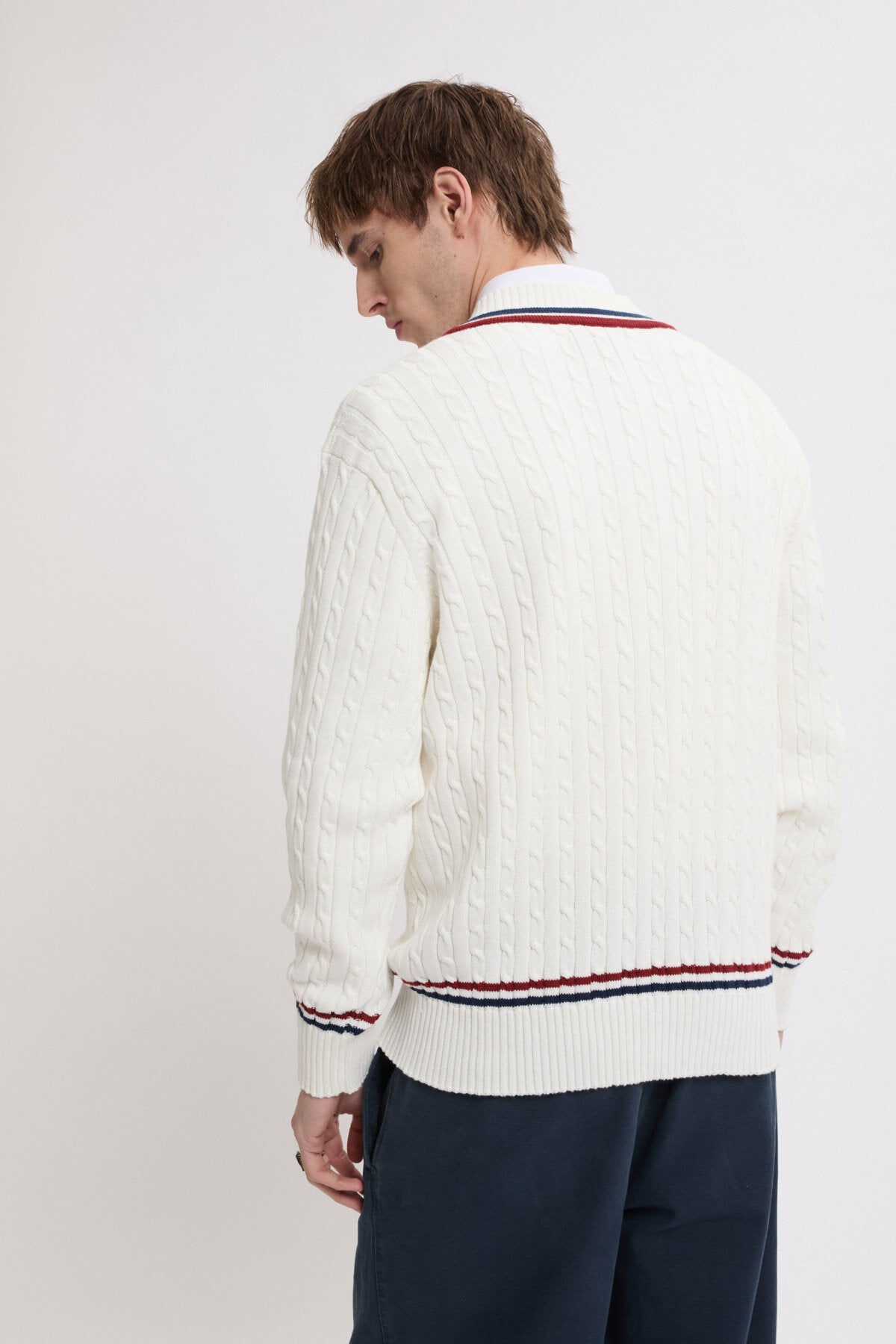 • Der Cricket V‑Neck besteht aus 100 % Baumwollstrick im Cable‑Knit‑Design – weich im Griff und zugleich robust genug für den täglichen Einsatz.