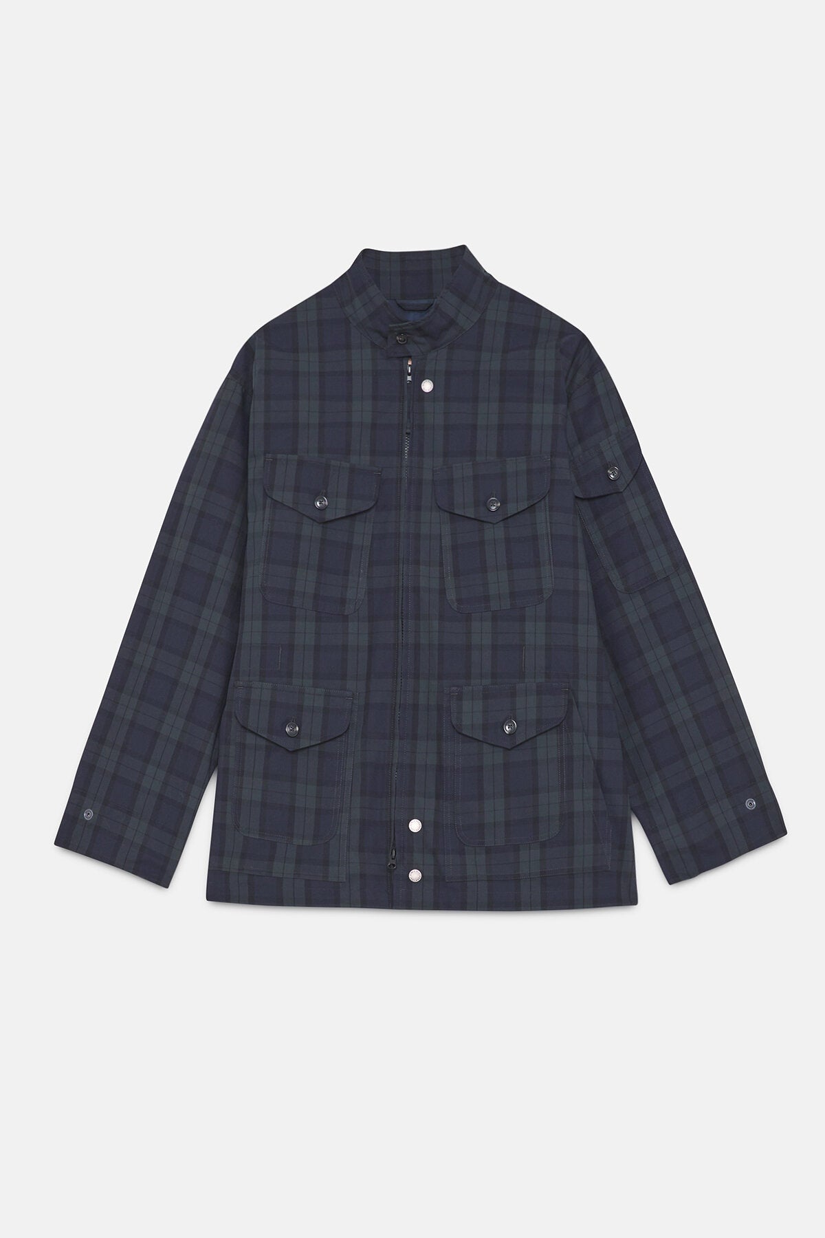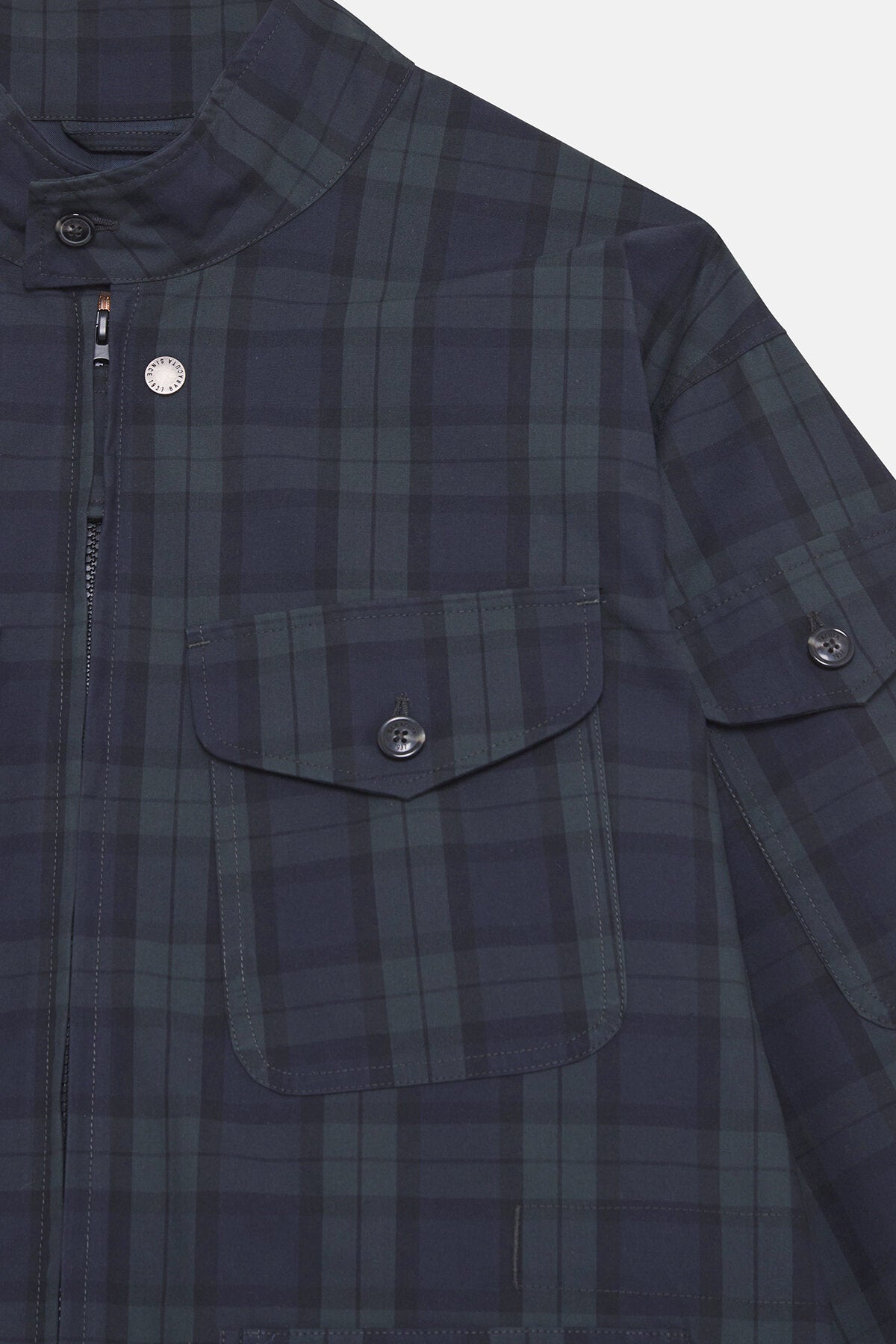 • • Eine aufgesetzte Tasche mit Patte und Druckknopfverschluss am linken Arm