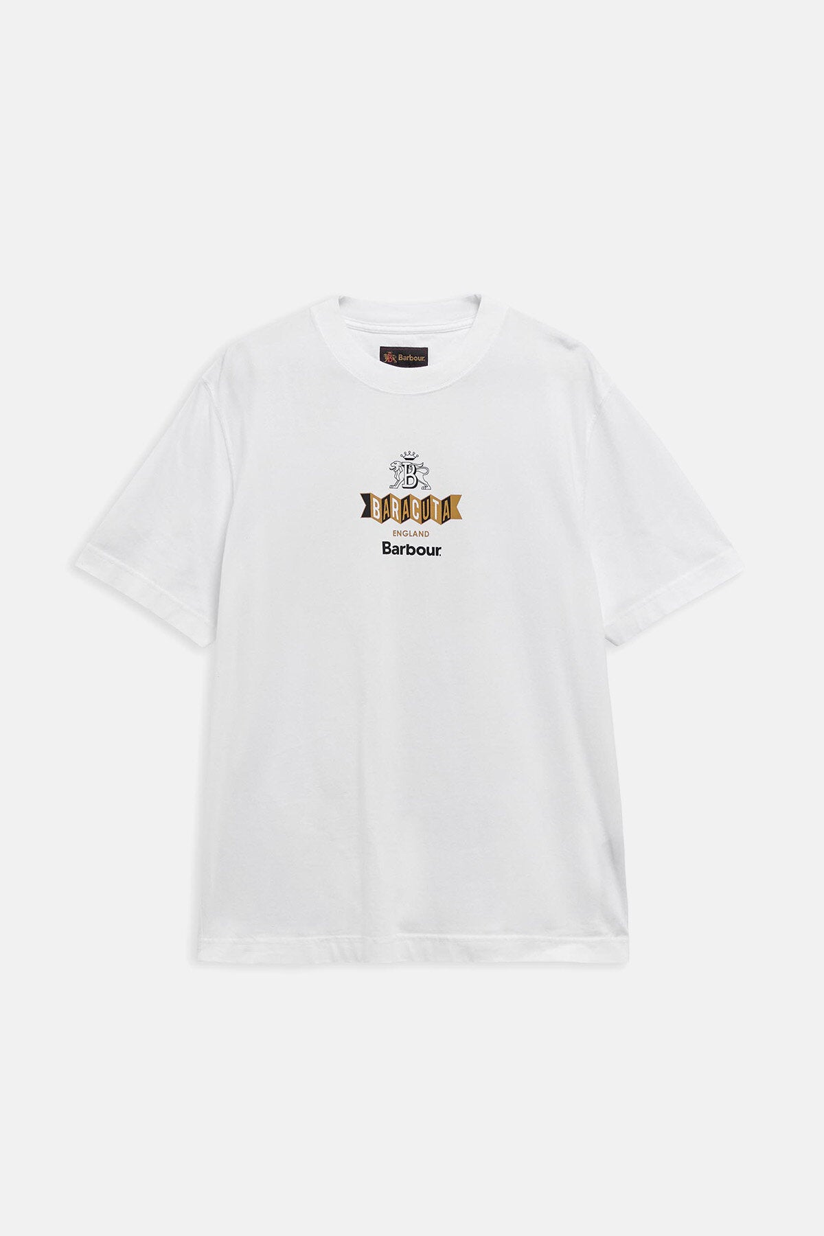 La T-shirt oversize Vinyl firmata Barbour x Baracuta aggiunge un vero tocco di carattere al tuo look da tutti i giorni. Caratterizzato da una grande stampa in vinile sulla parte posteriore e da due piccoli loghi sulla parte anteriore, questo capo è perfetto per aggiungere la giusta dose di audacia ai tuoi outfit.
