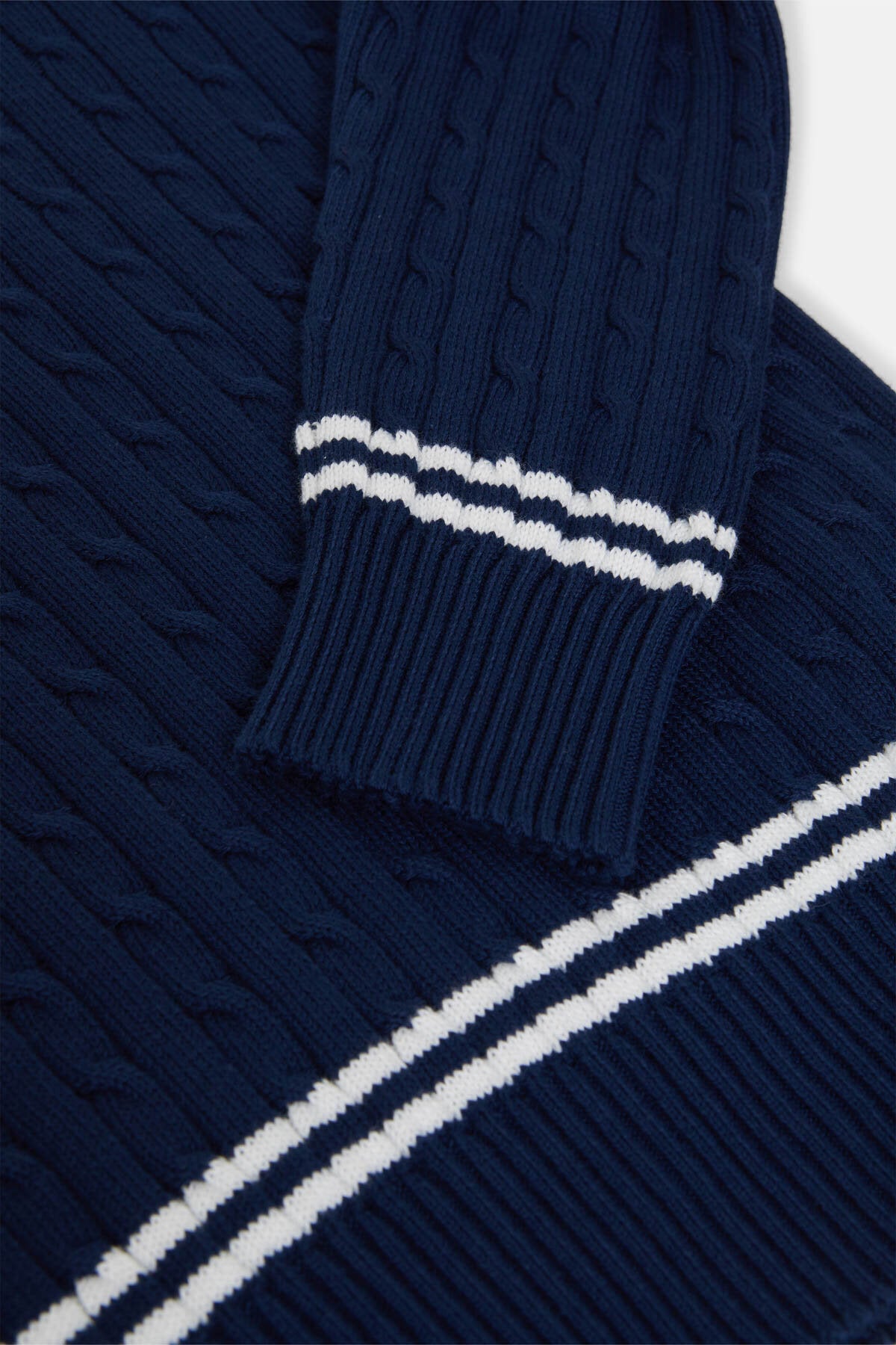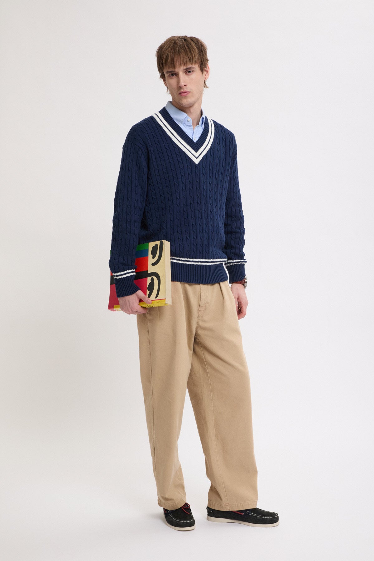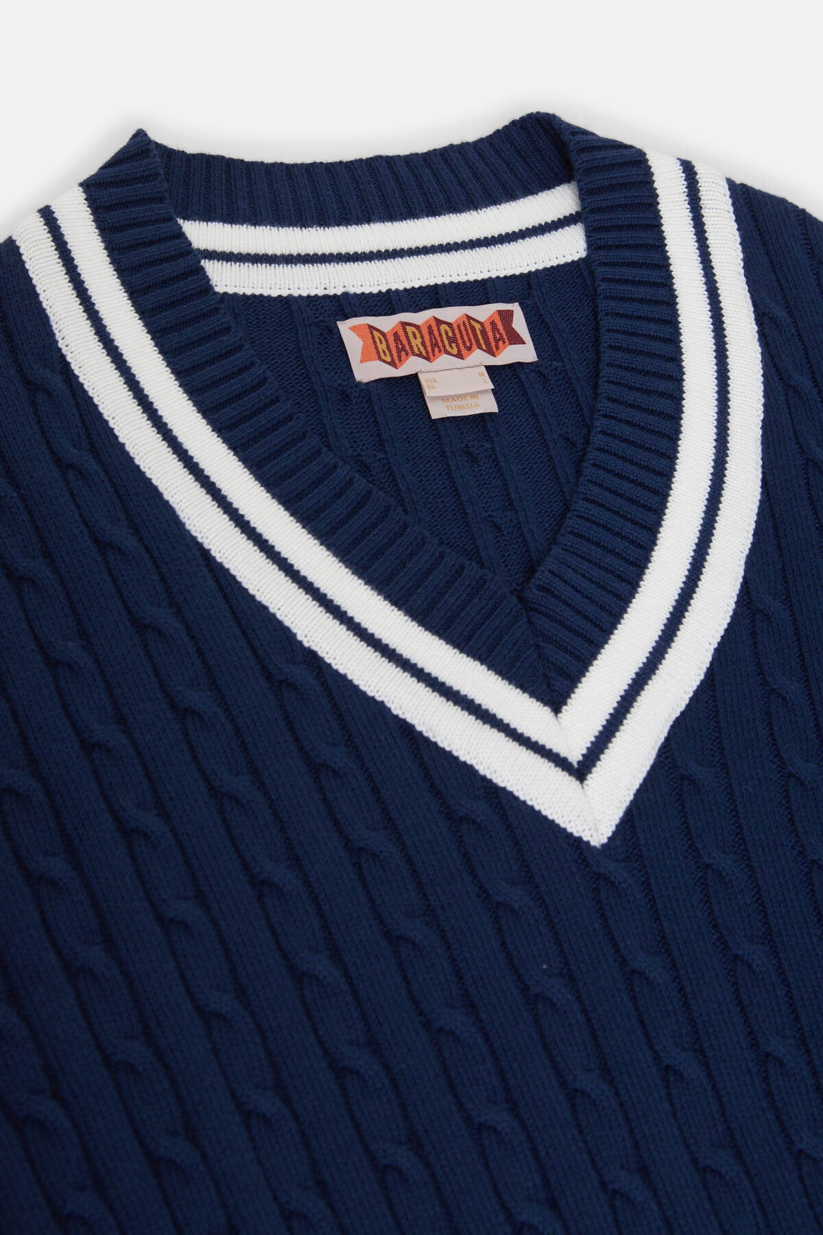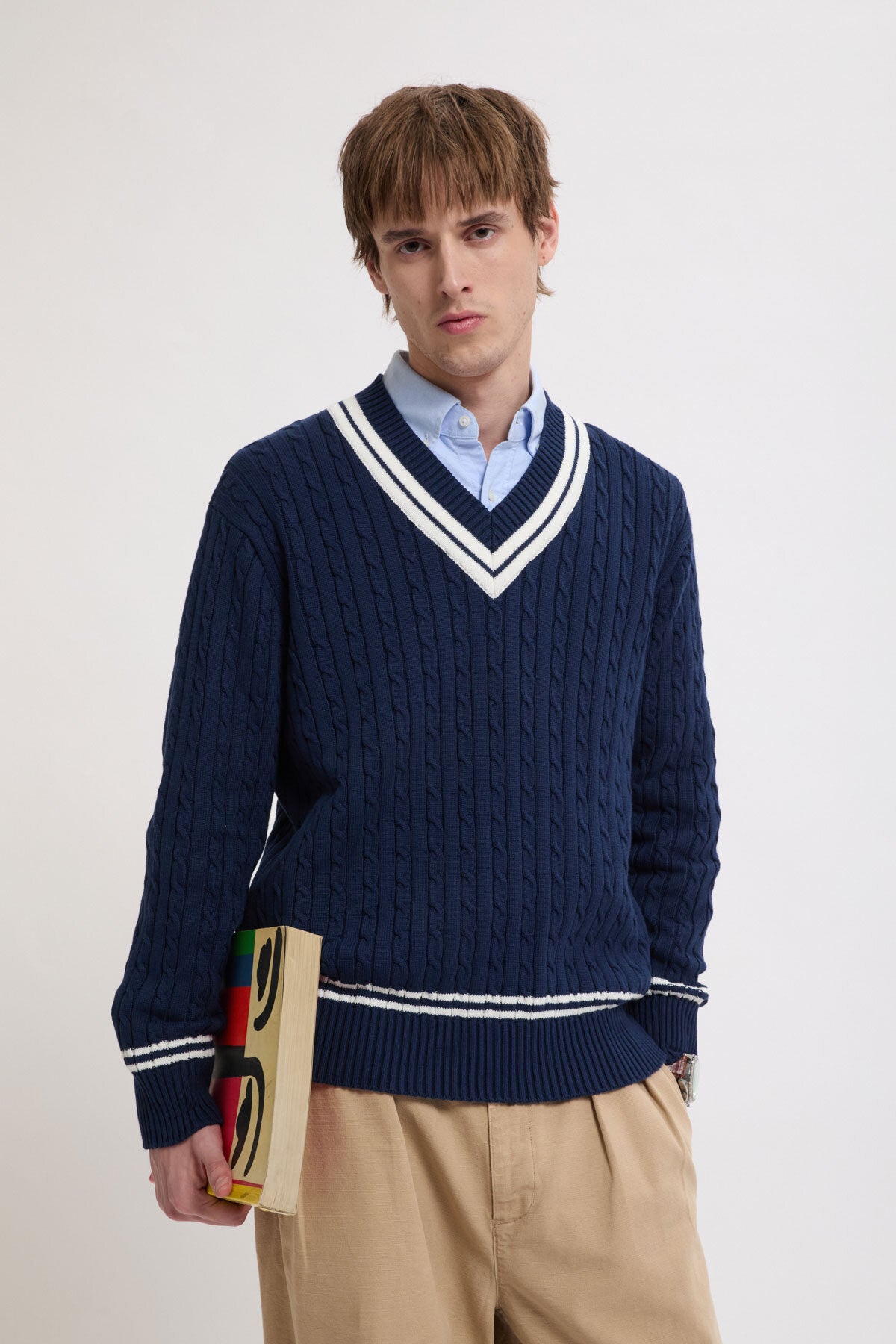 Il Maglione Cricket con scollo a V, realizzata con una lavorazione a maglia intrecciata in 100% cotone, è morbida ma al contempo robusta e perfetta da indossare tutti i giorni.