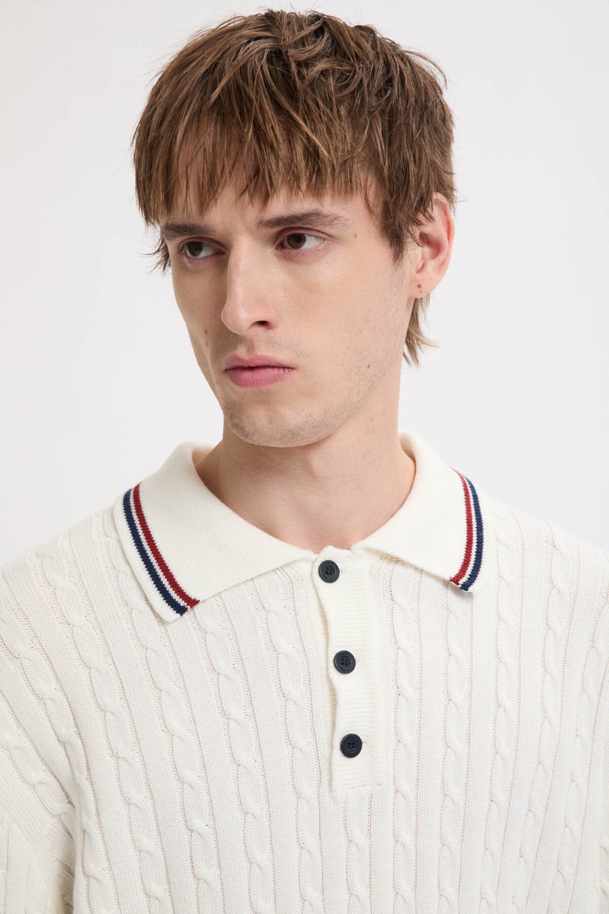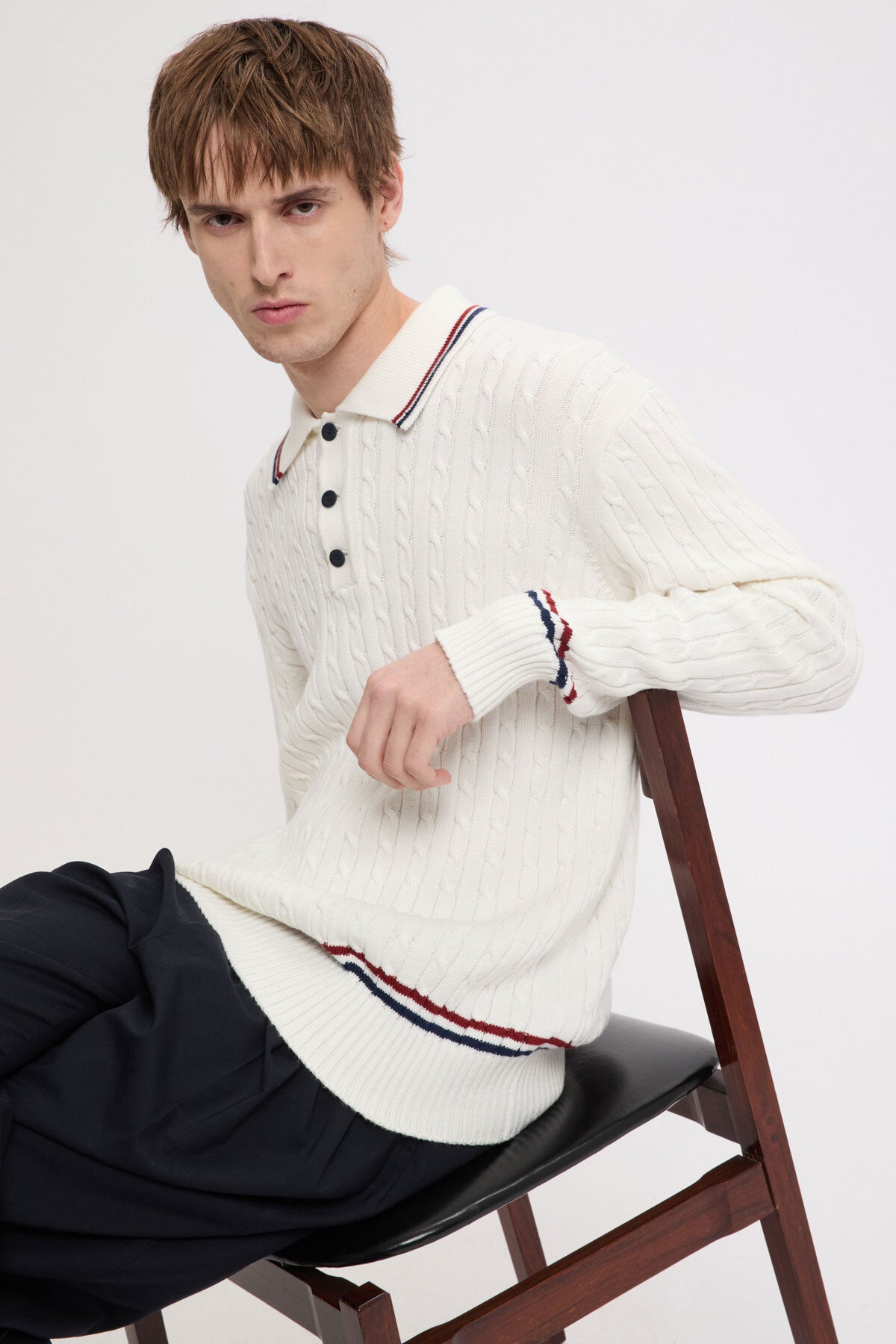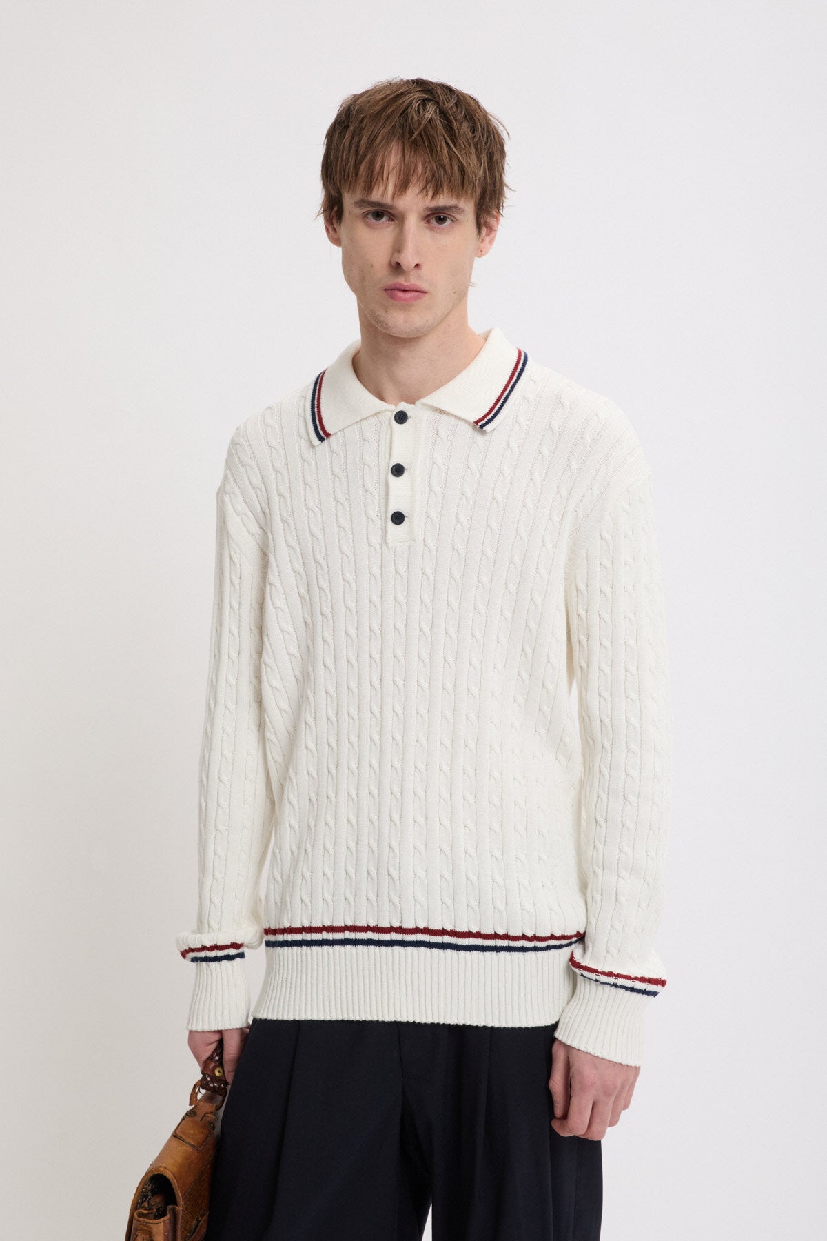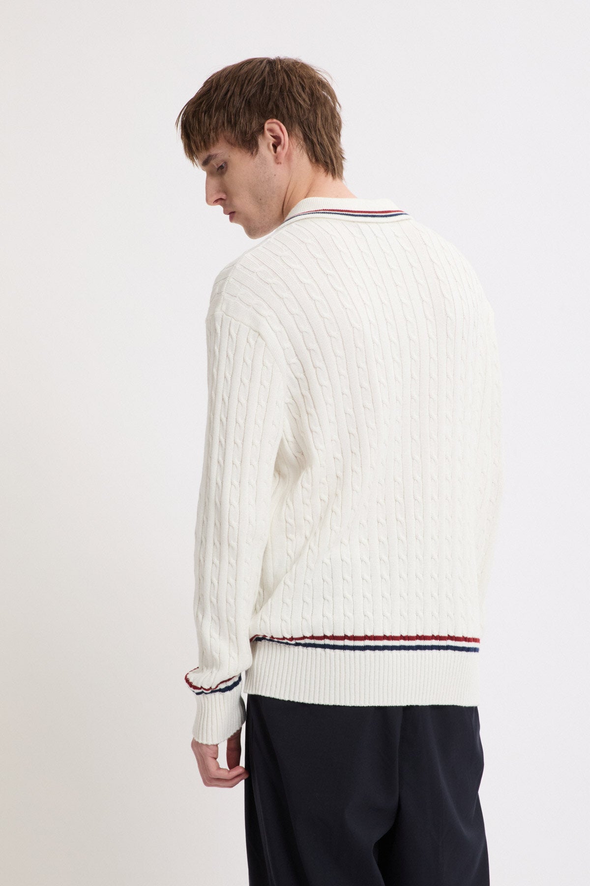• Contrasting stripes along collar, cuffs and waistband