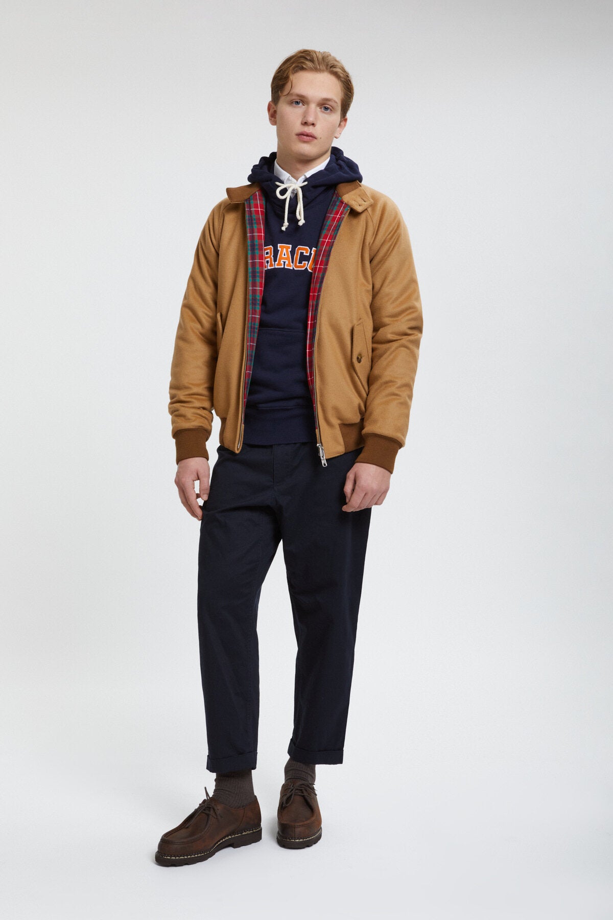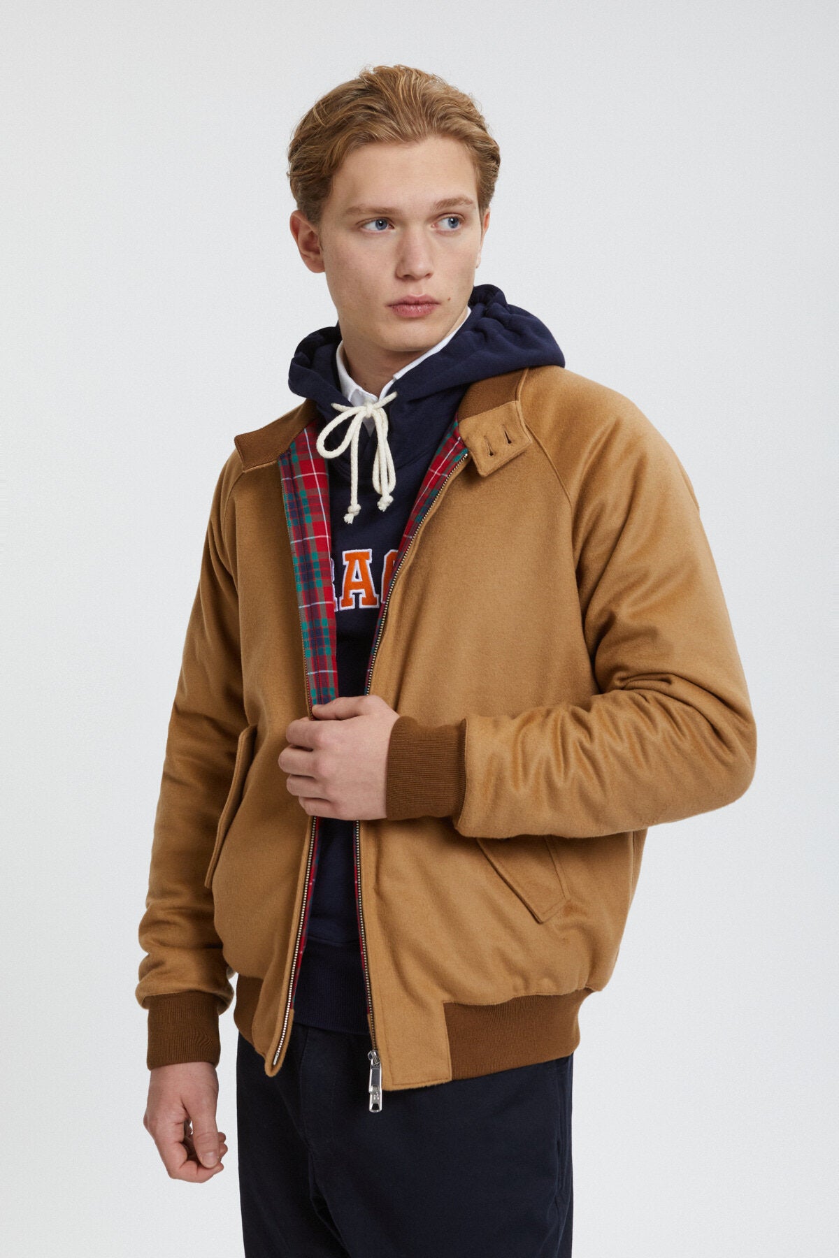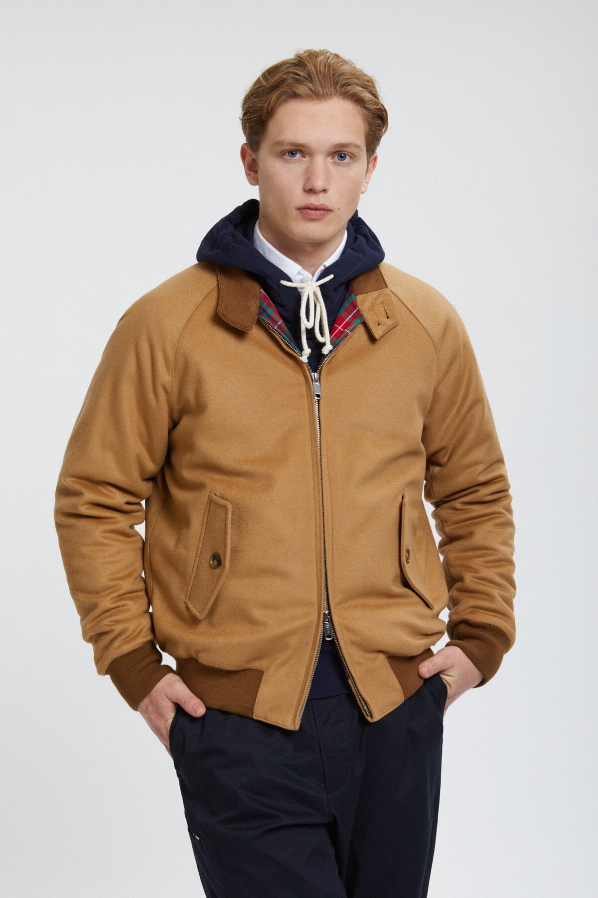 Prepare to fall in love with our G9 Melton Jacket, a winter-esque version of the classic G9 Harrington, made from the finest Italian wool-cashmere mix, making it one of the softest jackets you'll ever own. The lining is slightly padded for extra insulation and features the iconic Fraser Tartan lining. Perfect for more casual days out and about. To look even more put together pair it with our snazzy Corduroy Trousers. Maded in the UK