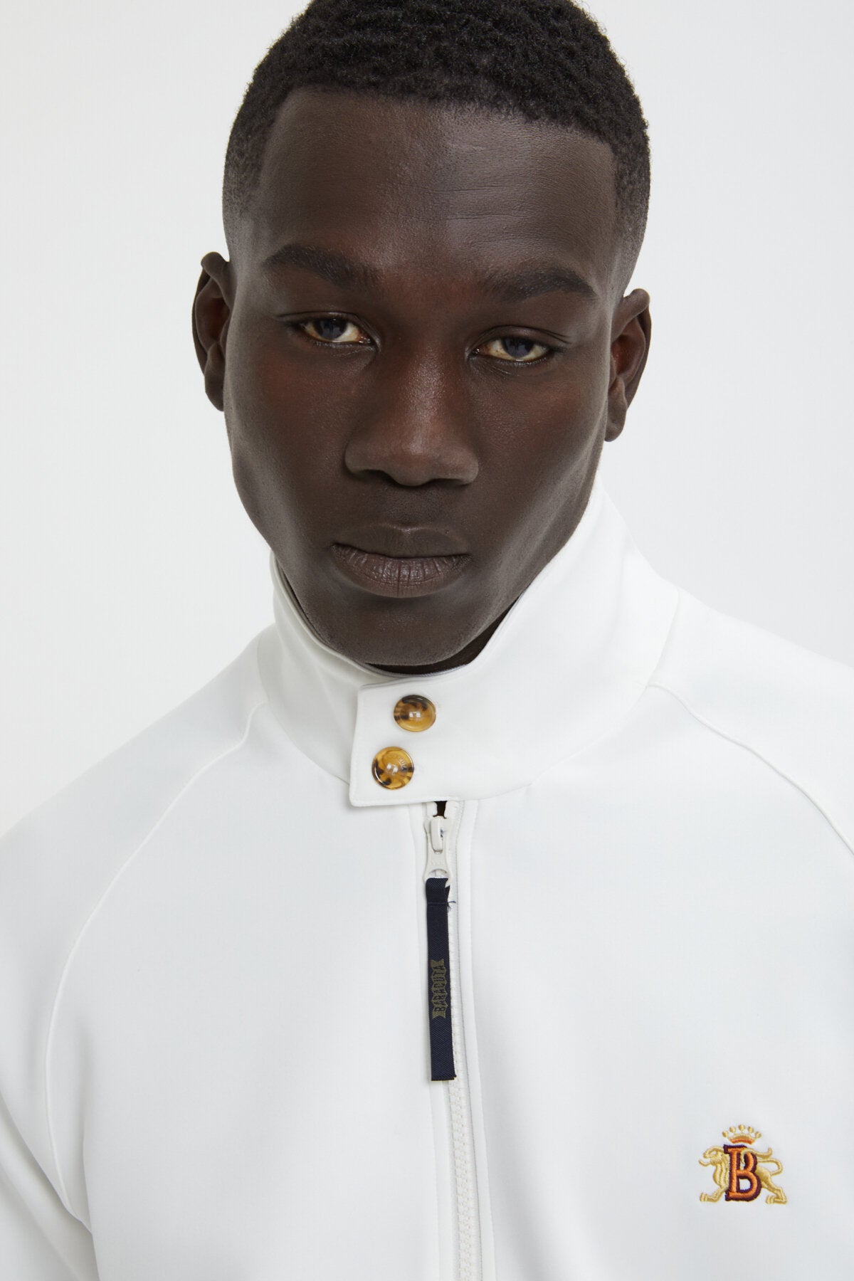 • • Internally ribbed tone-on-tone Dog Ear collar with a double button closure in personalised Baracuta buttons