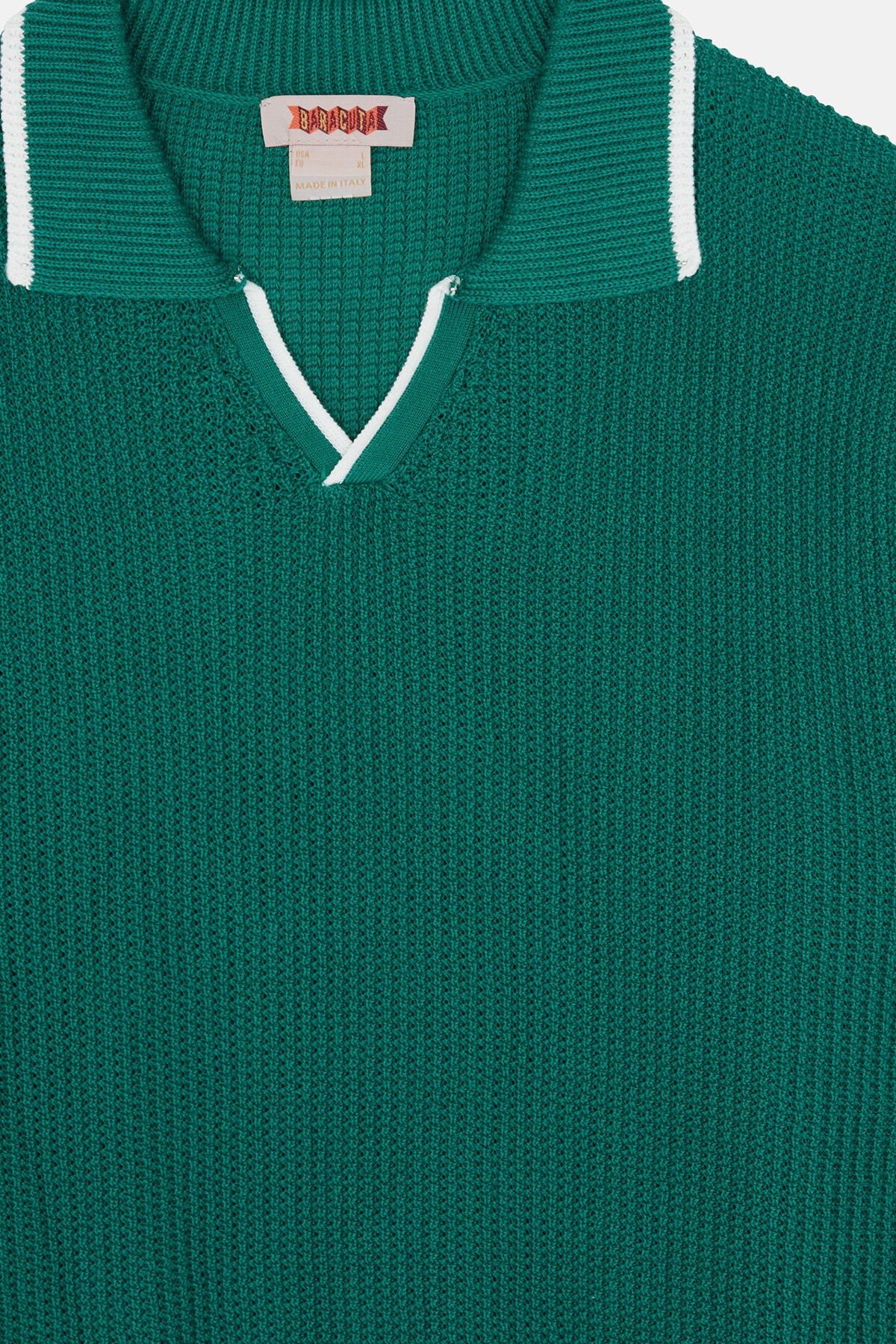 • If you have something special coming up boy have we the perfect polo for you. This long-sleeved V-neck Mesh Polo is made from 100% cotton waffle mesh allowing for breathability when the weather gets a little too warm. Embellished with the Baracuta logo above the waistline, you have the choice of keeping it or removing it. Whether it's warm or cold out, this long-sleeved polo can be worn as a light jumper or as an extra layer under your G9 Harrington! Made in Italy.