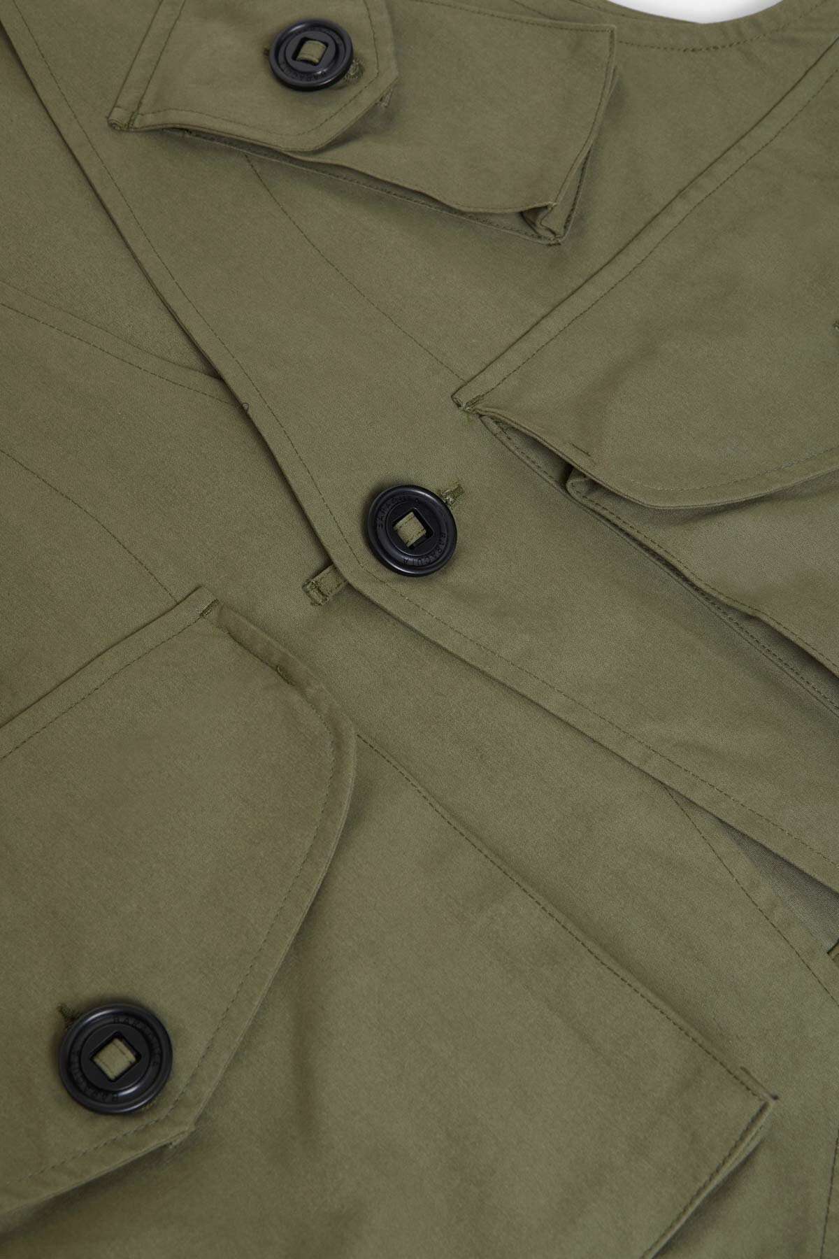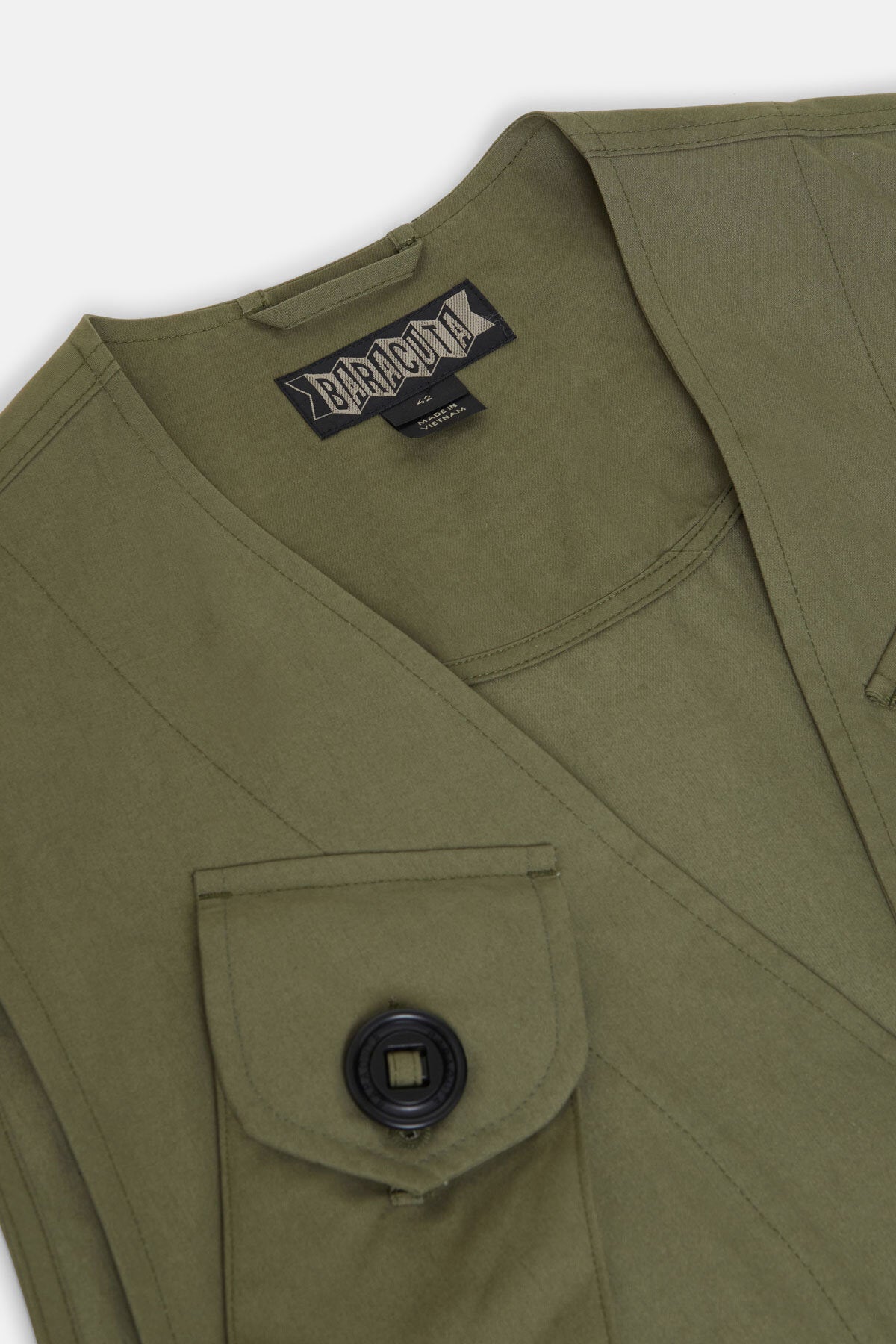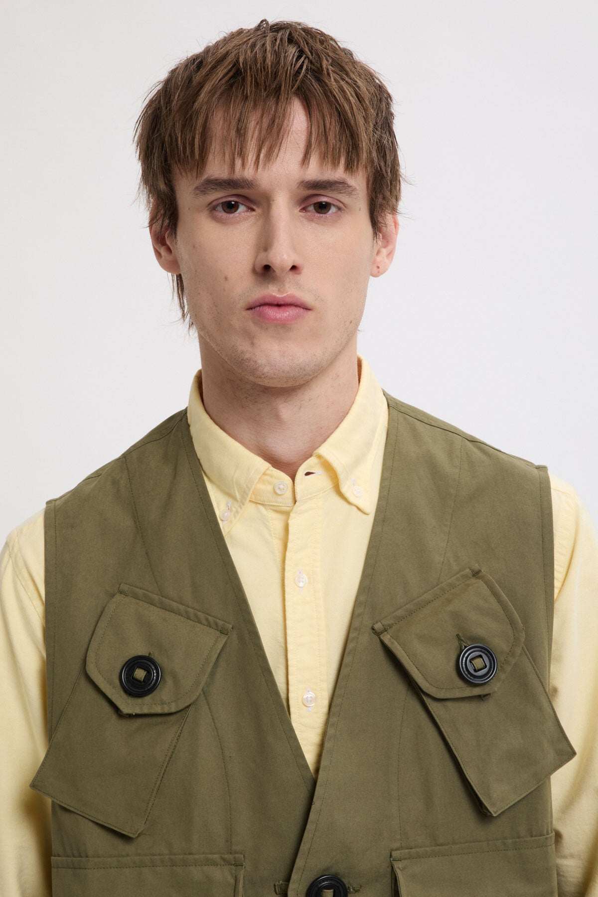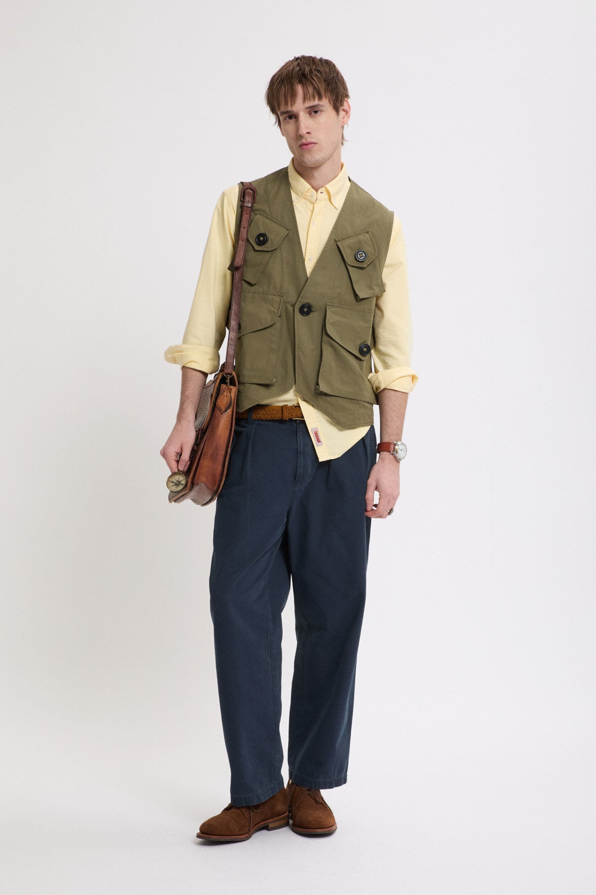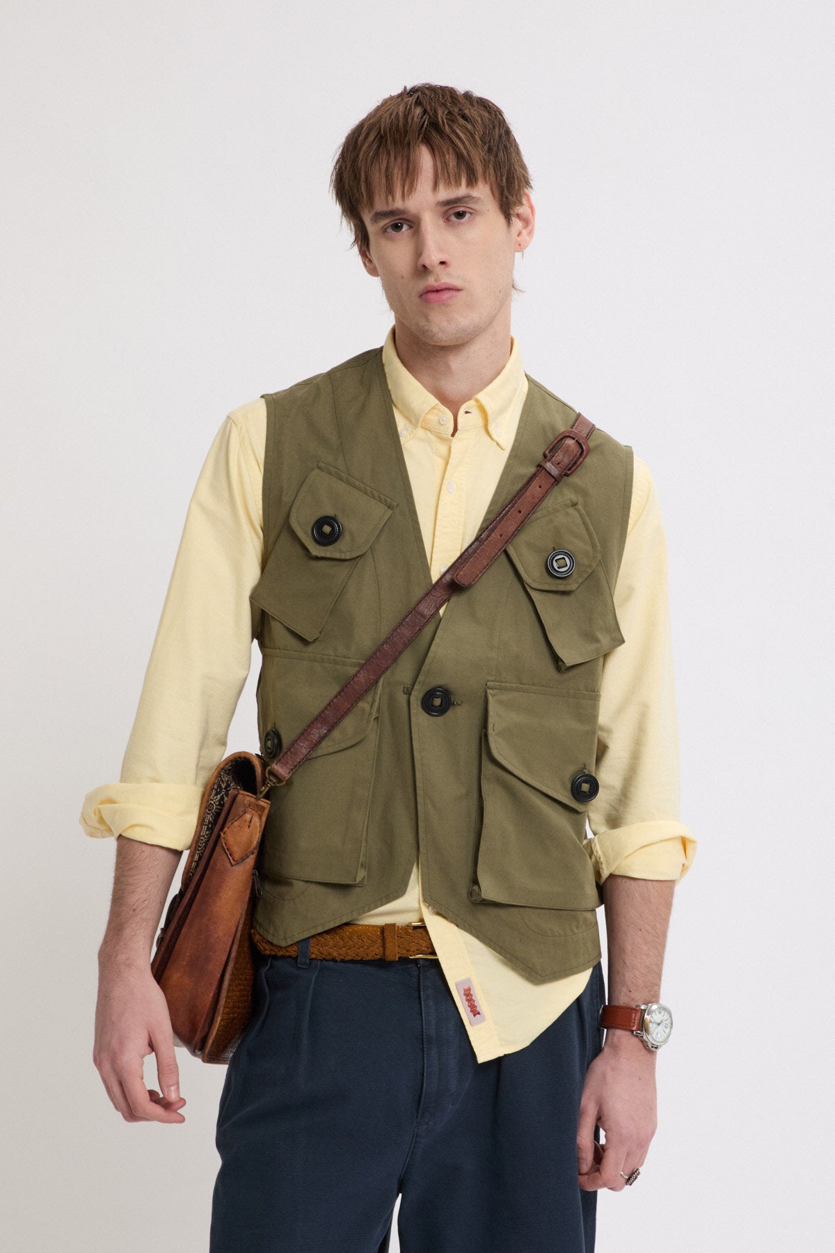 • The Sailing Cargo Vest is made from 100% cotton poplin, a crisp, lightweight fabric known for its smooth finish and structured drape. Poplin holds its shape at every fold, giving the vest a clean, tailored appearance while remaining easy to move in. Designed with practical detailing, it features two rectangular chest pockets and oversized patch pockets with flaps and button closures. This vest is ideally worn over shirts tshirts or knitwear.